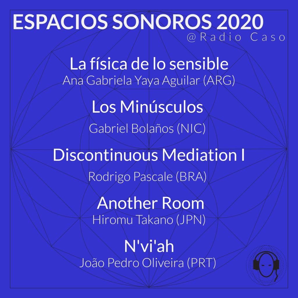 October 14 at 8:00pm (ARG) and October 15 at 4:00pm (ARG), Online. The fixed media work Discontinuous Mediation is played at Espacios Sonoros 2020 Festival organized by Espacios Sonoros (Salta, Argentina)