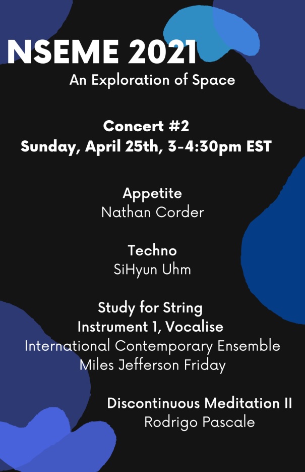 March 25 at 3pm (EST), Online. The composition Discontinuous Mediation II is played in NSEME 2021, An Exploration of Space’s Concert #2.