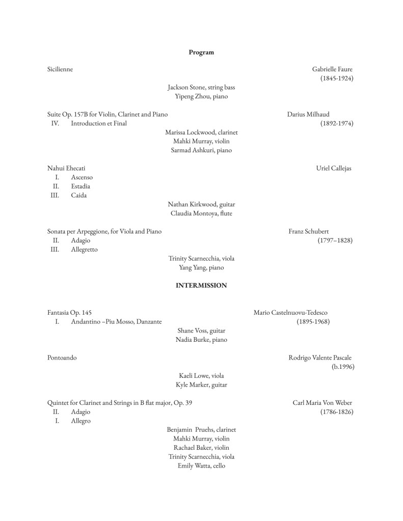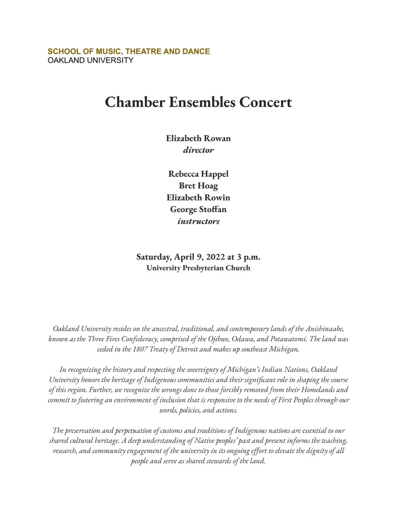 April 9 at 3pm (EST), University Presbyterian Church – 1385 S Adams Rd, Rochester Hills, MI. The composition Pontoando is premièred by Kaeli Lowe (viola) and Kyle Marker (guitar) at the Chamber Ensembles Concert.
