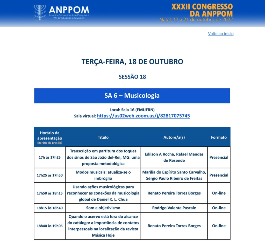 October 18, Escola de Música da UFRN – 1R. Cel. João Medeiros – Lagoa Nova, Natal – RN – Brazil. Rodrigo Pascale presents his article “Som e Objetivismo” at the XXXII Congresso da ANPPOM.
