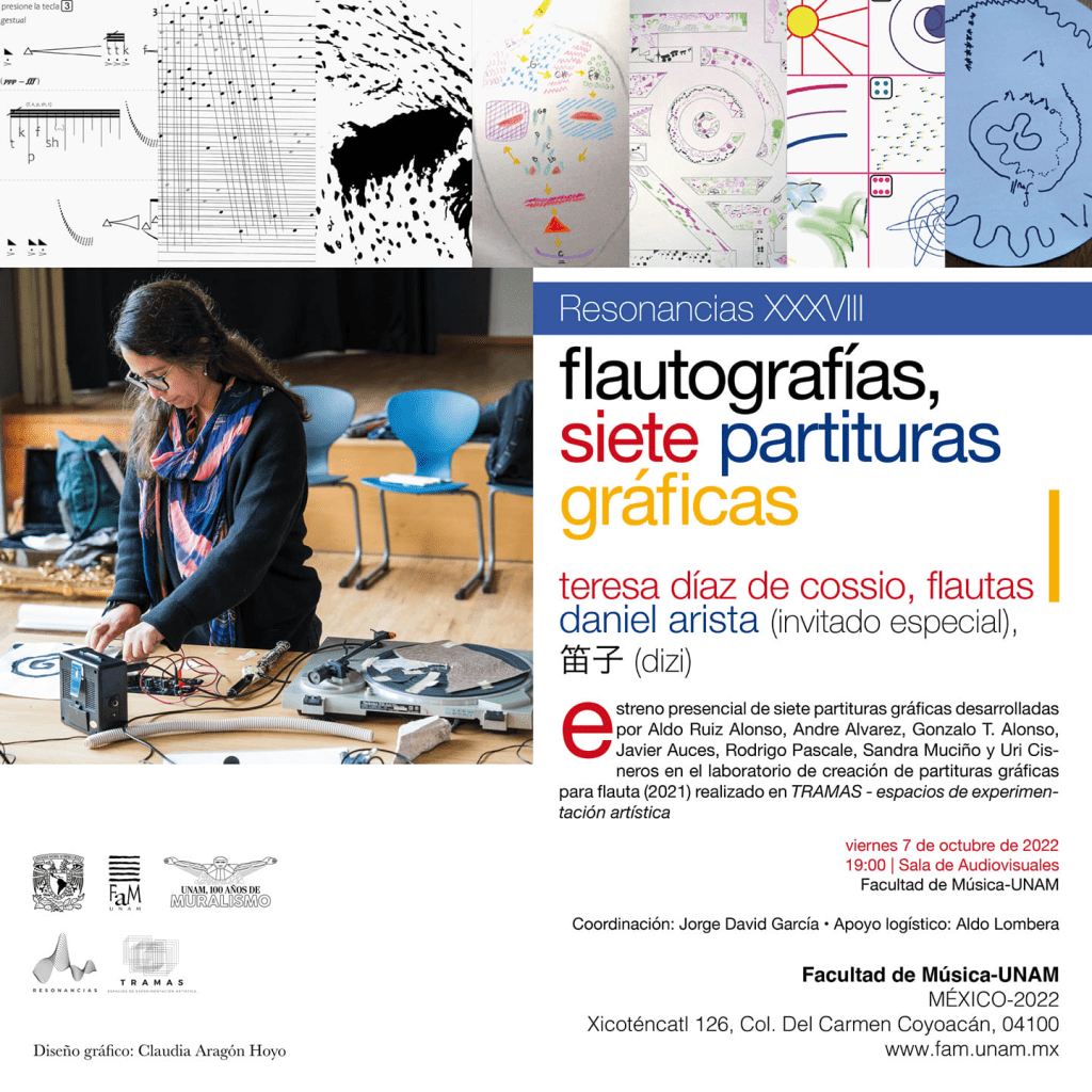 October 7, Facultad de Música FaM UNAM – C. Xicoténcatl 126, Del Carmen, Coyoacán, Ciudad de México, CDMX, Mexico. The composition Malleable is played by Teresa Díaz de Cossio at the Resonancias XXXVIII – Flautografias, Siete Partituras Gráficas.