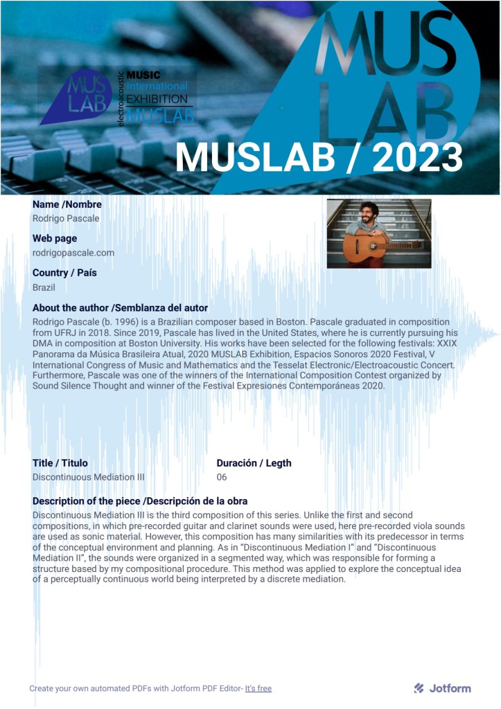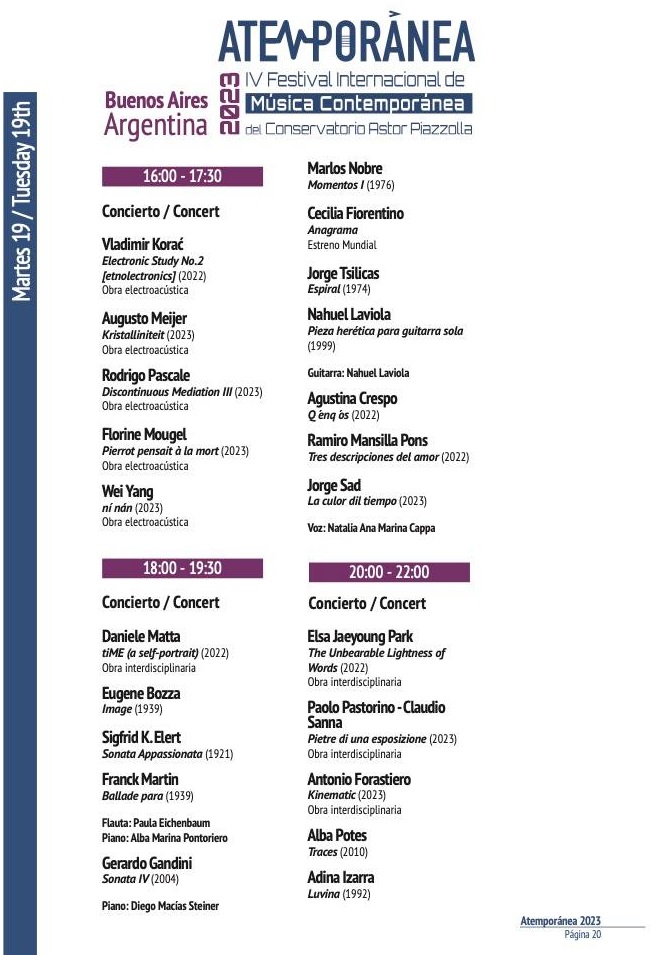 September 19 at 4pm (Argentina Standard Time), Conservatorio Superior de Música Astor Piazzolla – Sarmiento 3401, C1196 CABA, Argentina. The Fixed Media composition Discontinuous Mediation III was be played at the Atemporánea IV Festival Internacional de Música Contemporánea del Conservatorio Astor Piazzolla.