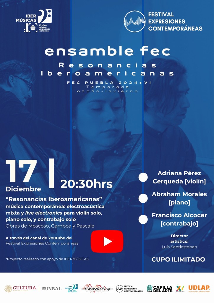 December 17 at 20:30 (Mexico City Time), Online. The composition Confim, assim, sem fim performed by Francisco Alcocer is broadcast as part of the Resonancias Iberoamericanas series of concerts.