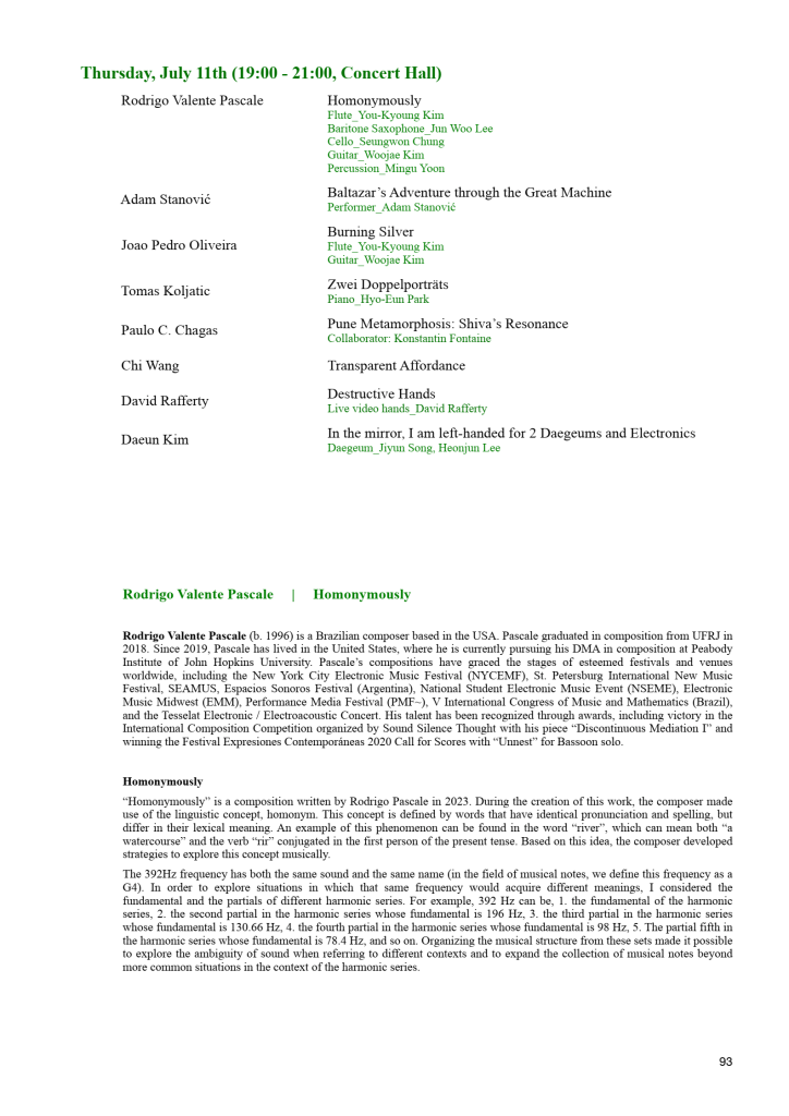 July 11 at 19:00 (South Korean Time), Hanyang University’s Concert Hall, 222 Wangsimni-ro, Seongdong-gu, Seoul, South Korea. The composition Homonymously is premiered at the ICMC 2024’s Concert D.
