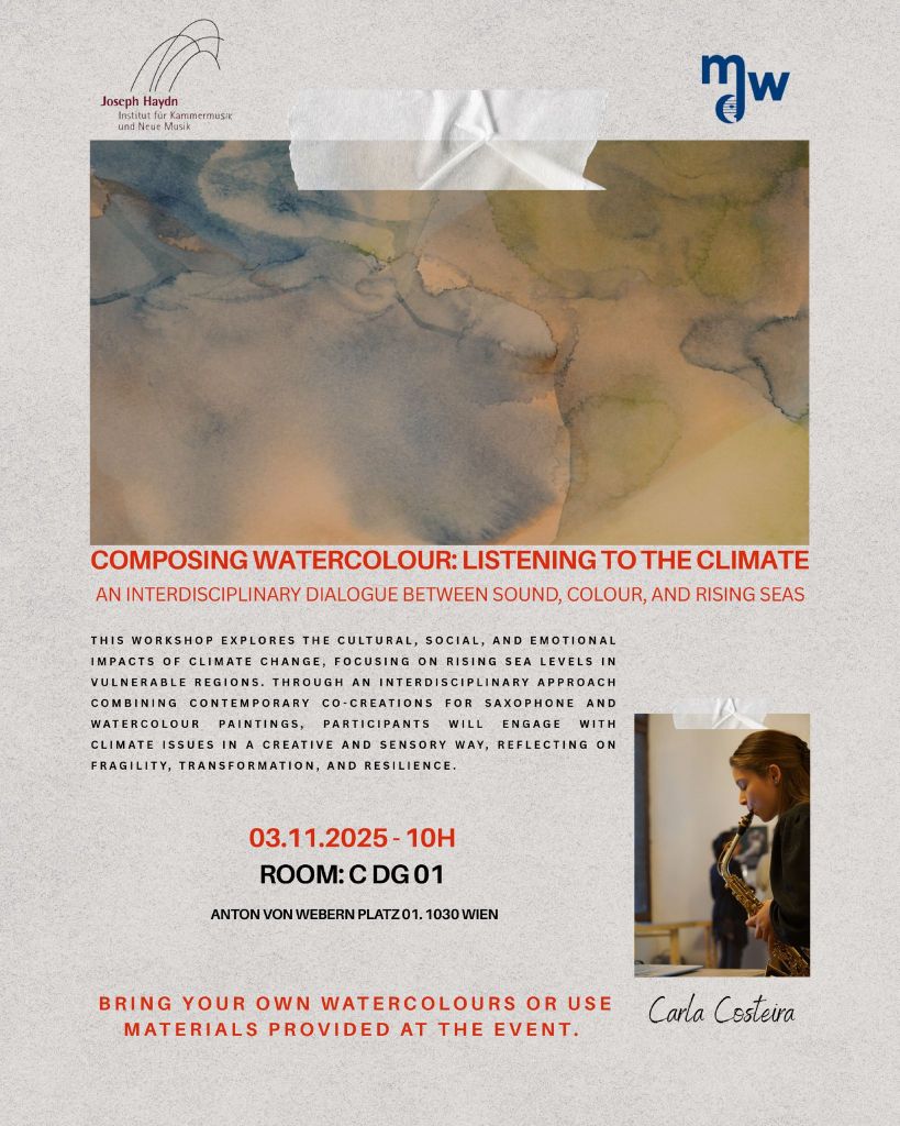 November 3 at 10:00am (GMT+1), Room: C DG 01, Universität für Musik und darstellende Kunst Wien – Anton-von-Webern-Platz 1, Wien, Austria. Le citta gemelle disuguali for alto sax and electronics is performed by Carla Costeira during her workshop Composing Watercolour: Listening to the Climate.
