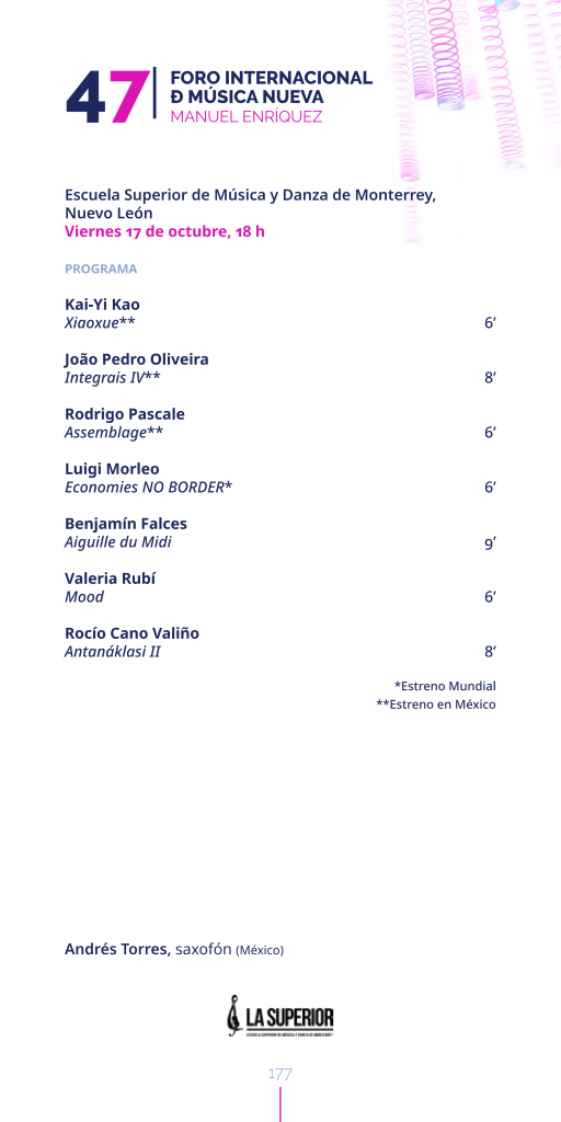 October 17 at 18:00 (GMT-6), Escuela Superior de Música y Danza de Monterrey, Obispado, 64060 Monterrey, N.L., México. Assemblage for Baritone Sax performed by Andrés Torres during the 47 Foro Internacional Ð Música Nueva Manuel Enríquez.